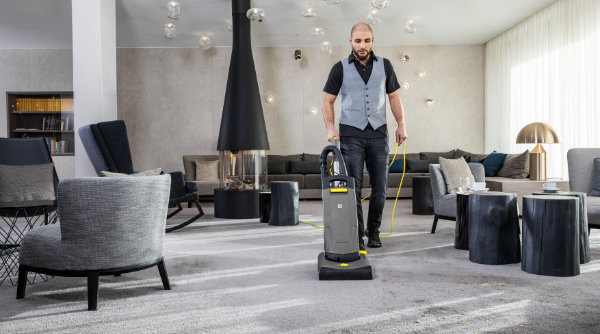 A Spray Extraction Carpet Cleaner is used for fibre-deep cleaning carpets. In order to restore the design and colour to their original condition, the selected cleaning agent is worked into the carpet by using either a floor nozzle or with a nozzle and brush system (for walk behind machines) and applying a specialised detergent spray under pressure. The loosened dirt is then vacuumed back up again as part of the same process by the Spray Extraction Carpet Cleaner. After this has been completed, it is advisable that the carpet that has been cleaned is rinsed with clean water only, once again vacuuming this up at the same time. An Upright Brush-type Vacuum Cleaner is then used to vacuum the surface once it has fully air-dried (for at least eight hours). During this drying period, it is important that nobody walks on the floor whilst it is drying.