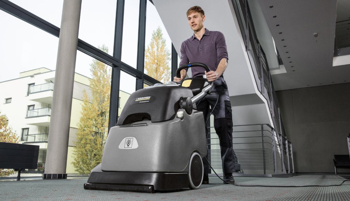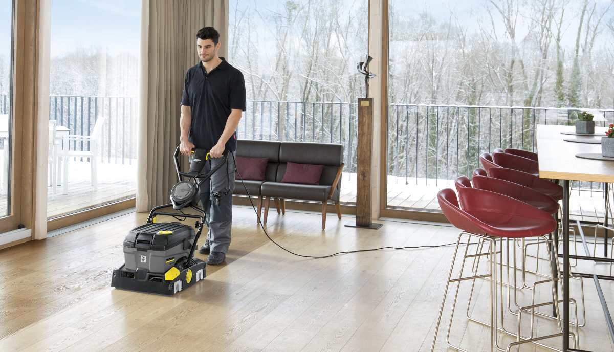 A disc type scrubber drier (BD) is ideal for smooth floors, whilst a roller brush scrubber drier (BR) is more suitable for uneven surfaces such as safety flooring, ceramic or riven tiles, although both types are still considerably more effective than a conventional manual mopping system. FloorPro Wipe Care RM 780 makes for an ideal cleaning agent since it generates little foam and does not pose a risk of slipping once cleaning is complete.